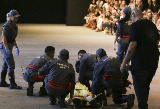 观众一开始还以为这是走秀表演的一部分,直到惊讶地看到急救人员冲上台帮忙,并把他带离了现场,才明白发生了什么。