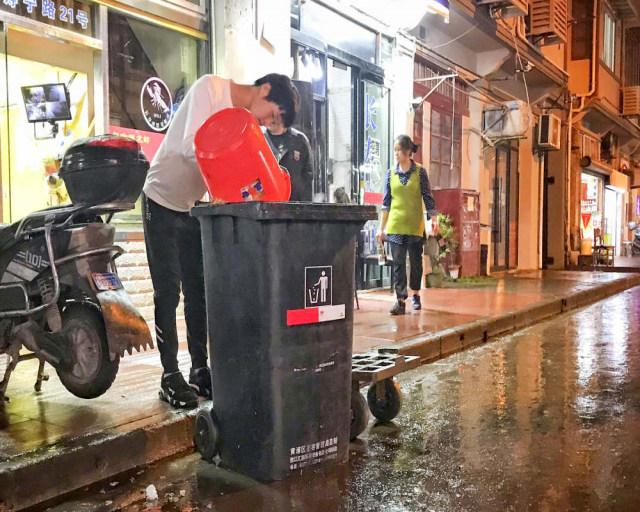 ▲淡水路上的饭店工作人员在倾倒餐厨垃圾