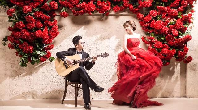 婚纱照里的他们,一个穿着西装,一个穿着红裙,两人深情互望,嘴角上扬,幸福之情溢于言表。