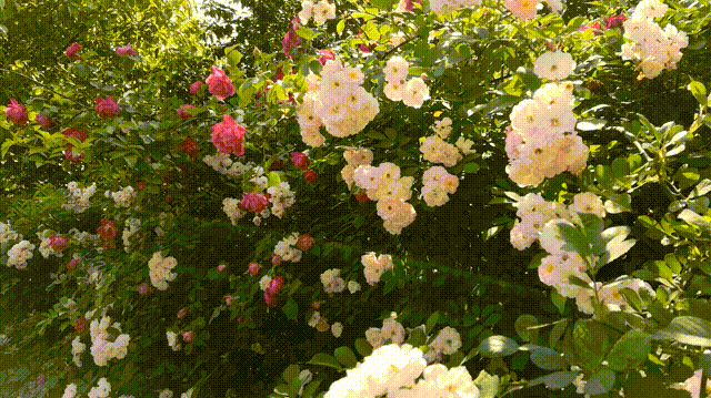 蔷薇花一簇一簇地盛开着,在层层叠叠的花瓣间有嗡嗡的蜜蜂钻进钻出。淡淡的粉色,一簇一簇的依偎在一起。在道路旁从这一头一直延伸到另一头,像是一个美丽的宫殿,四周洋溢着粉色的花香。