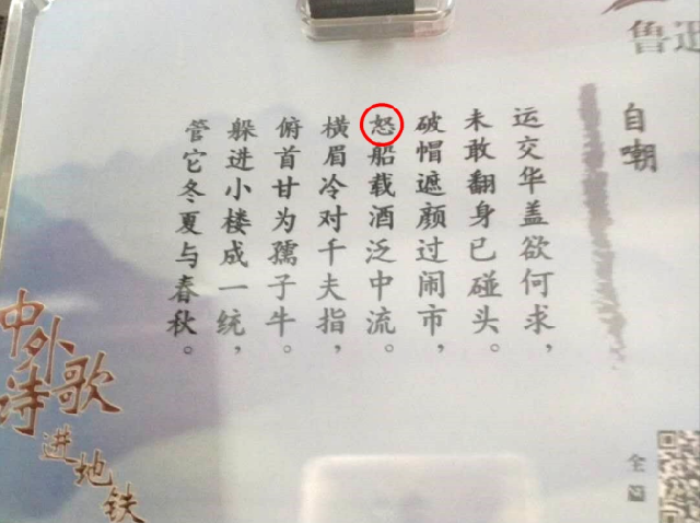 说起诗名《自嘲》你也许不熟悉,但其第三联“横眉冷对千夫指,俯首甘为孺子牛”可谓家喻户晓。葛筱宁老师近日在乘坐上海地铁11号线时发现,车厢拉手上展示的《自嘲》诗中,第二联“怒船载酒泛中流”一句的“怒”字有误。