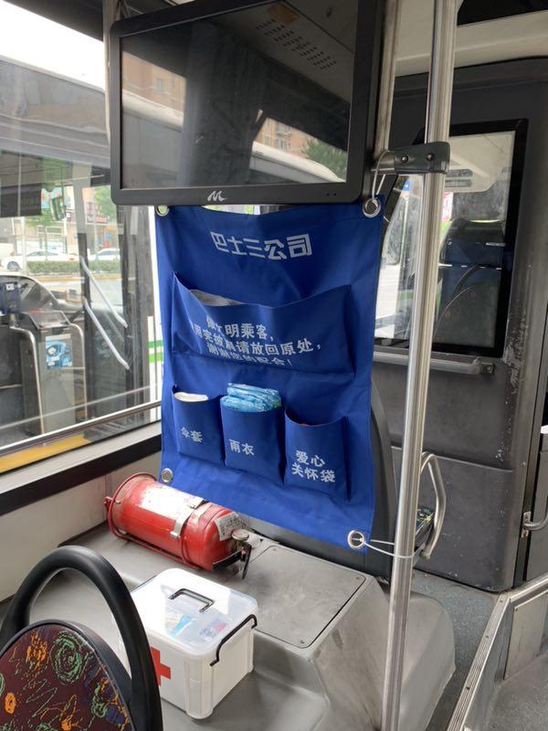 为避免乘客发生晕车后造成呕吐现象的发生,爱心关怀袋中还放置了环保袋,同时还将医药箱安放在车厢前门处。