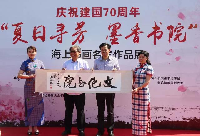 现场笔会后,庆祝建国70周年“夏日寻芳 墨香书院”——海上书画名家作品展在夏果飘香的黄华村桑葚园举行启动仪式。