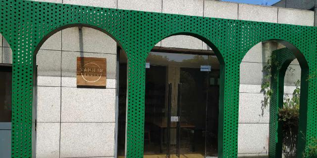 建筑本身依然是那座灰色的小房子,不过外观变新了,还装上了亮堂的落地玻璃门。门前竖着一块墨绿色指示牌,上面写着“宝山区‘众文空间’”字样。墙上还有块木牌,标示这里是“宝山区图书馆特色服务点”。