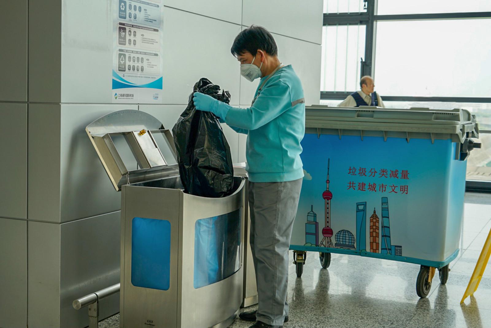 此外,浦东机场增购了40辆垃圾收运车,专门用于航站楼内垃圾容器里的垃圾转运。专业保洁人员每天定点定时收集和初步分类放入垃圾收运车,运送至垃圾周转房后再由保洁人员对垃圾进行再分拣和验收,保证100%分类合格。