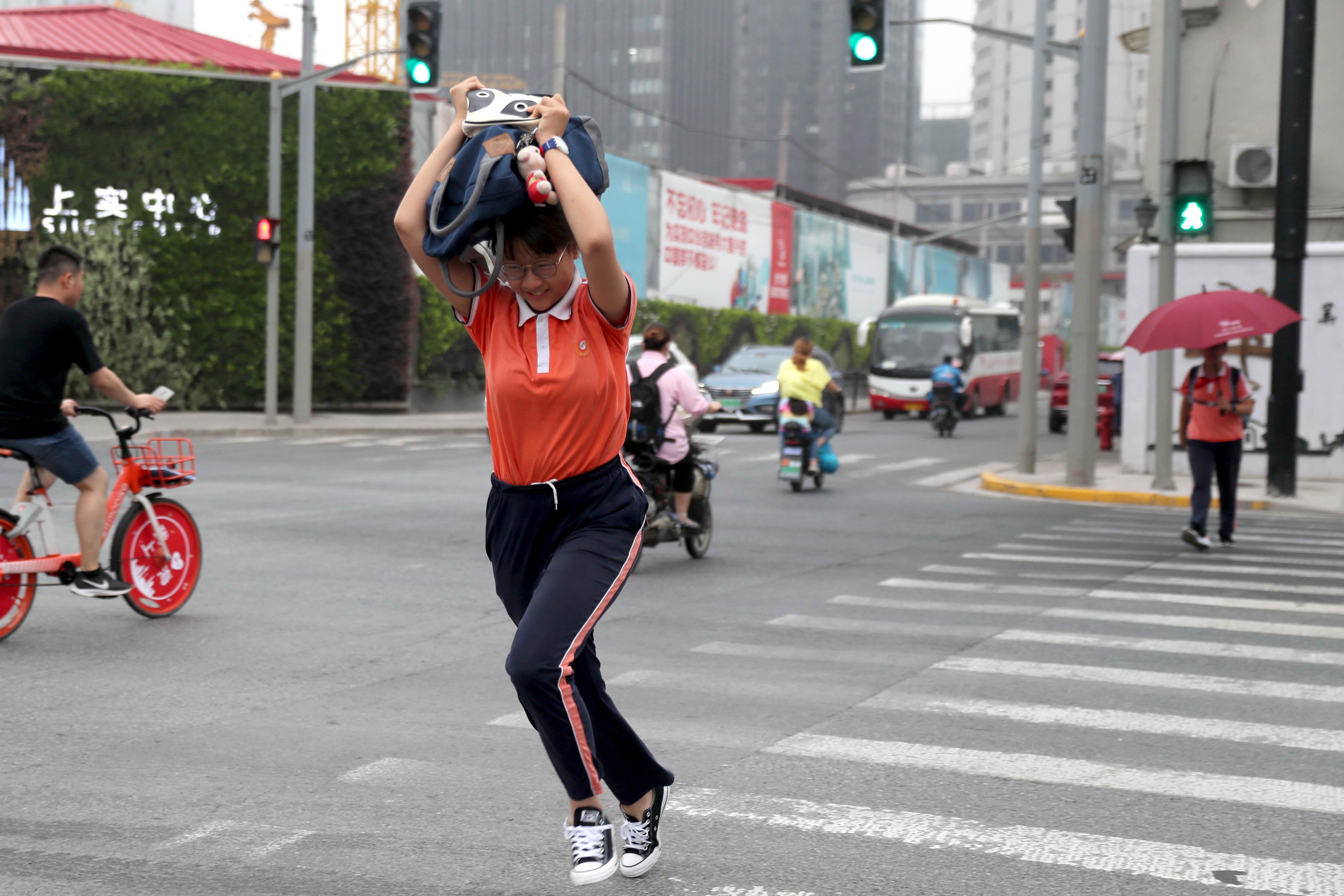 风雨来的急,未带伞的路人用包、用手机来挡风挡雨。