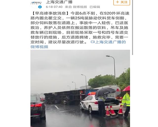 早上对交通情况影响最大的一起事故为:5时45分,S20内圈北翟路立交发生的一起1货车侧翻事故,4根车道占用3根,后方车辆通行缓慢。事故处理一直到9时10分才处理完毕,后方交通逐步恢复中。