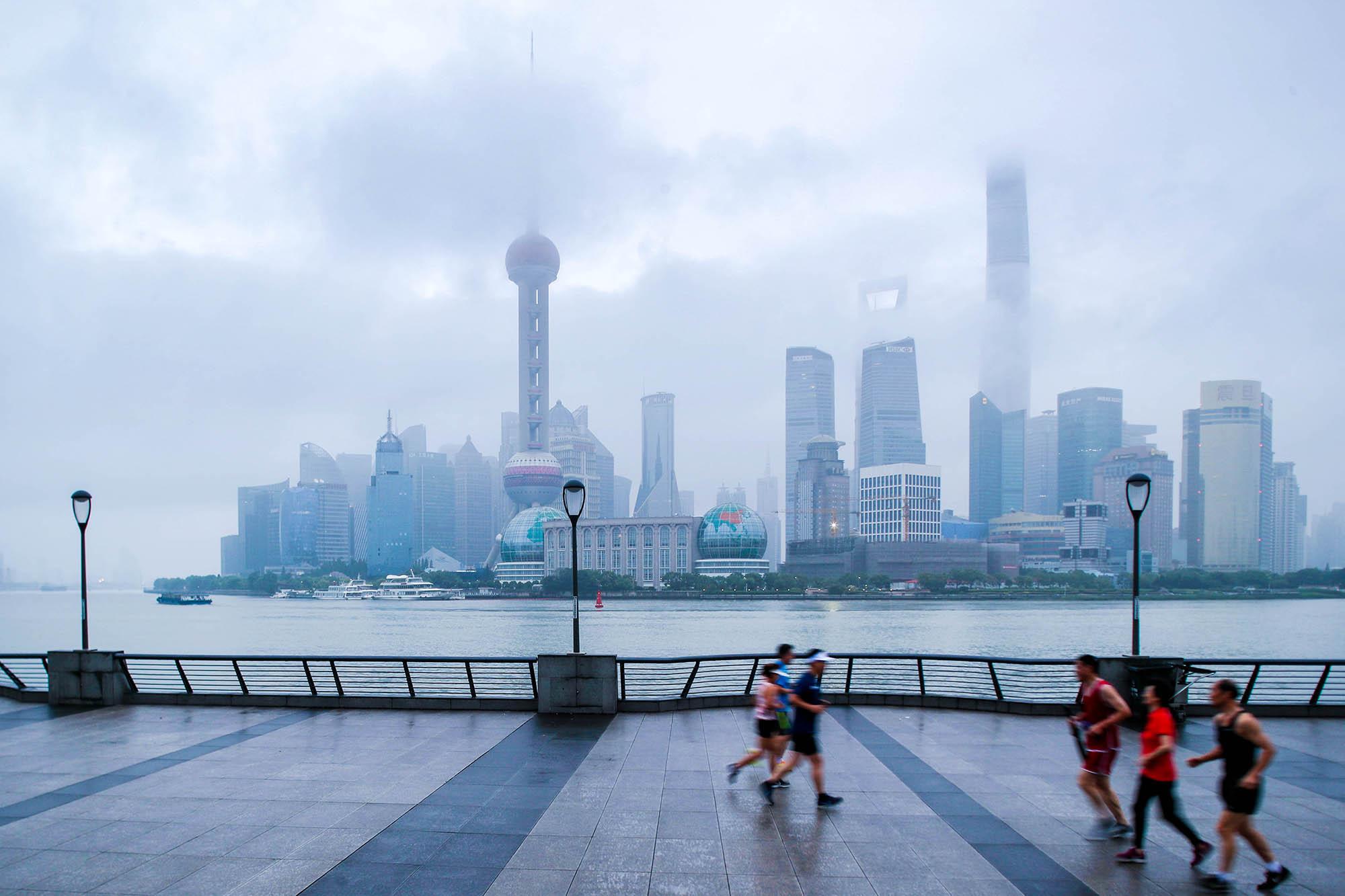 黄浦江畔微风拂面,晨练的市民趁着雨停间隙在外滩跑步健身。