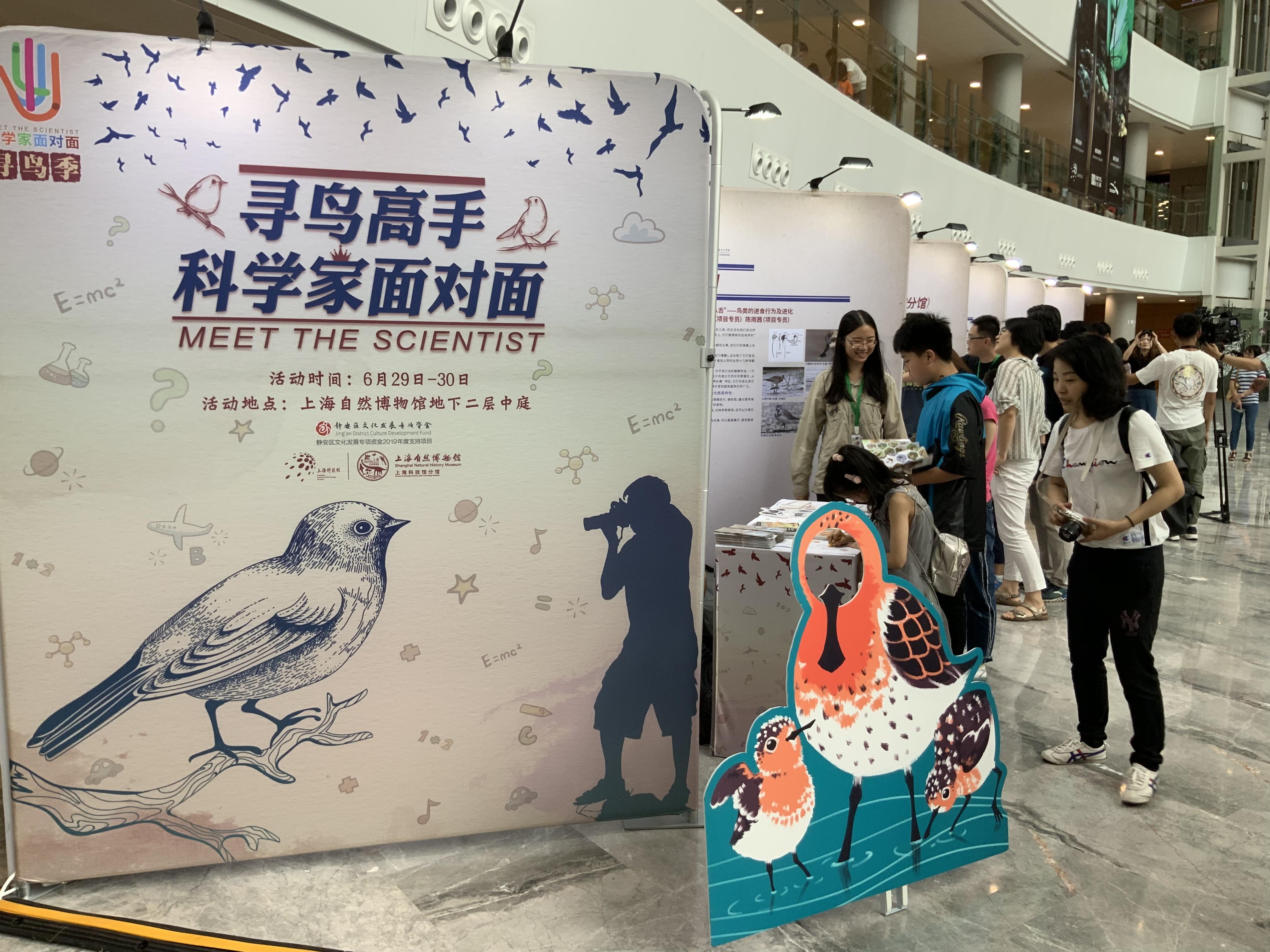 6月29-30日,来自浙江自然博物院、郑州自然博物馆与河南省野生鸟类观察学会、同济大学航空航天与力学学院、华东师范大学生命科学学院、中国科学院植物生理生态研究所、上海九段沙湿地自然保护区、湖北省野生动植物保护协会、勺嘴鹬在中国、上海动物园、上海自然博物馆(上海科技馆分馆)共10家单位的鸟类工作者们在展区内“搭台唱戏”,与公众交流鸟类研究成果、鸟类保护调查故事,解答大小朋友们对鸟类的疑问。