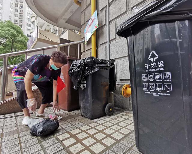 爱博大厦楼下,志愿者陆阿姨发现,早晨有个别居民倒入垃圾桶的湿垃圾没有分类,她马上帮忙重新分类。