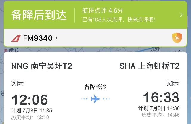 7月8日,网传上海航空FM9340航班,原计划11:35南宁吴圩机场T2起飞,14:30上海虹桥机场T2降落,因飞行途中氧气面罩释放,飞机备降在长沙黄花机场。