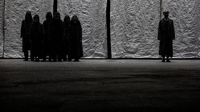 不规则且不平整的蛇皮袋将舞台封闭成一个白色空间,七位演员统一身披黑色斗篷,