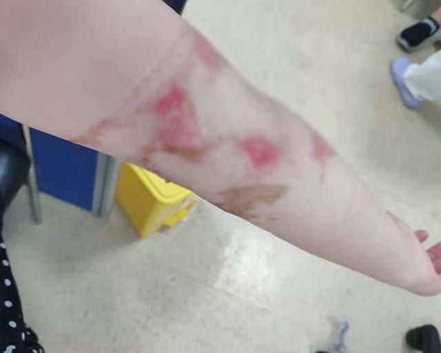 方女士的手臂被烧伤了。门店经理和店员当即打车将方女士送去了长海医院。直到7月5日,医院才拆除方女士胳膊上的纱布。医院出具的诊断证明称,方女士的胳膊为“烧伤后疤痕增生”。