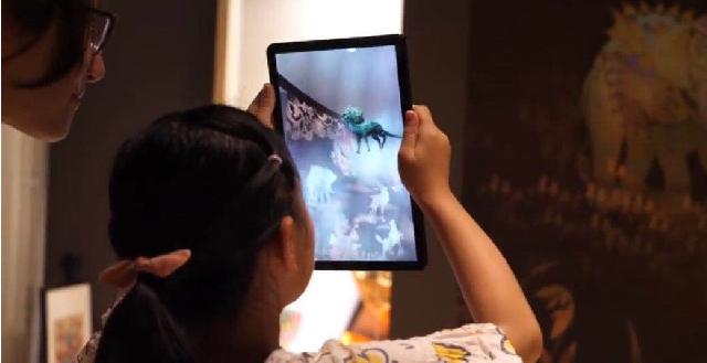 展厅入口,就是一件新媒体互动艺术品“与龙共舞”。观众通过挥舞手掌便能控制大屏幕上的神龙舞动,“召唤神龙”的同时,还伴有波谲云诡与电闪雷鸣。每个人手势不同,神龙的数量和舞动形态都会不一样,运气好的,能同时召唤出3条神龙,这才是“中国版的哈利波特”。