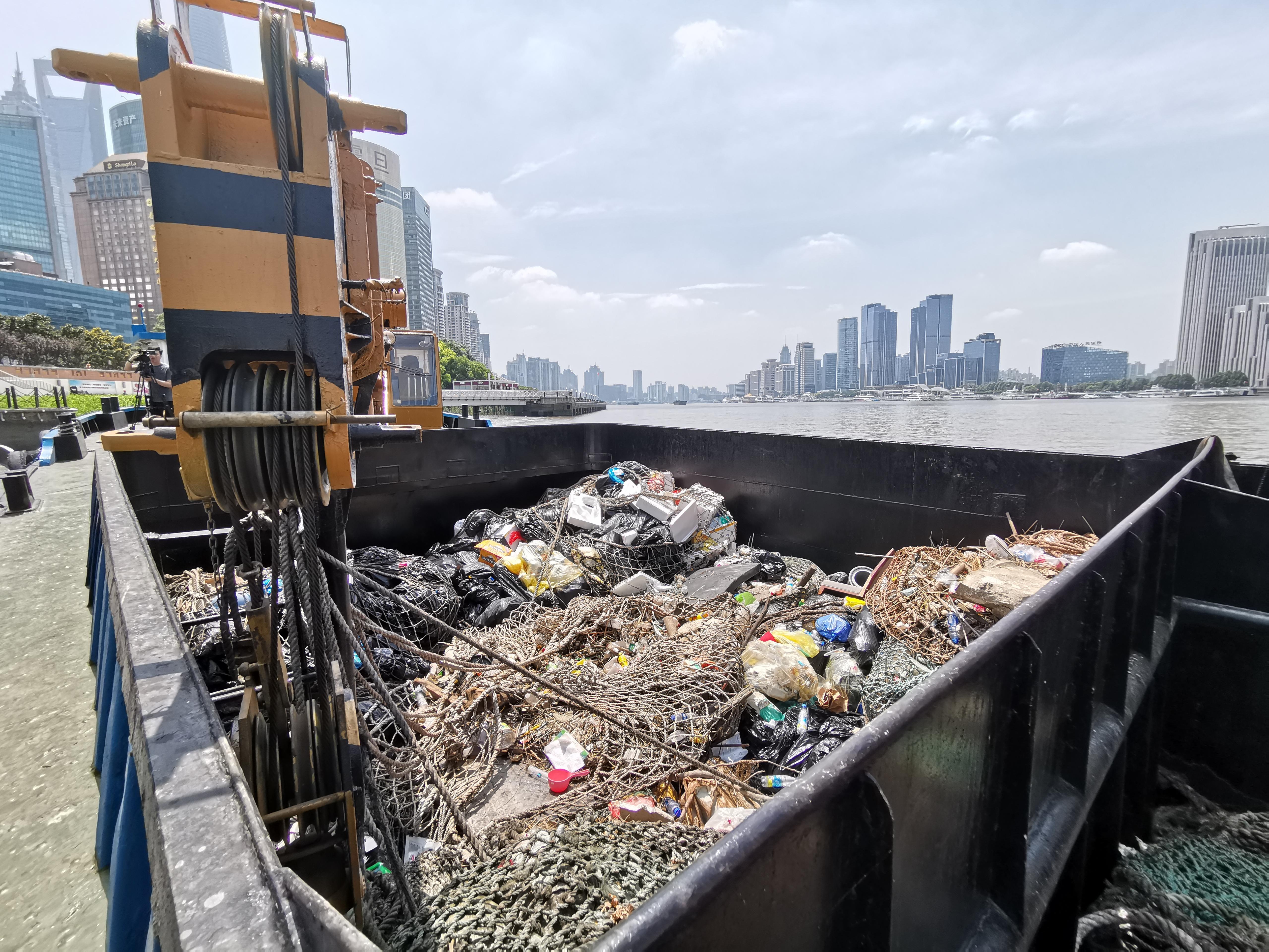 黄浦江每天约20多吨的水域垃圾里主要有塑料袋、饮料罐、食品包装袋、泡沫等生活垃圾、水草,以及一些大件木材。
