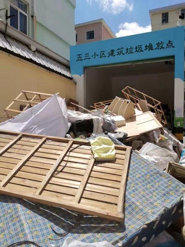 据东镇居委会书记汴勇杰介绍,该小区情况特殊,原来小区里的垃圾一直投放到对面小区的垃圾投放点,后来因对面小区经历了动迁,小区没有了垃圾投放点。因为找不到合适的地方修建垃圾房,物业在小区门口设置了临时的垃圾投放点,但这个点位还没有得到批准,正在向街道申请。