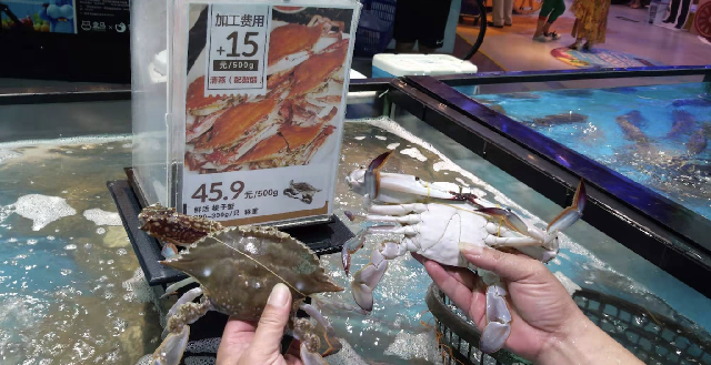 最近周到君发现,在盒马门店的海鲜区里,新鲜的梭子蟹到货了!