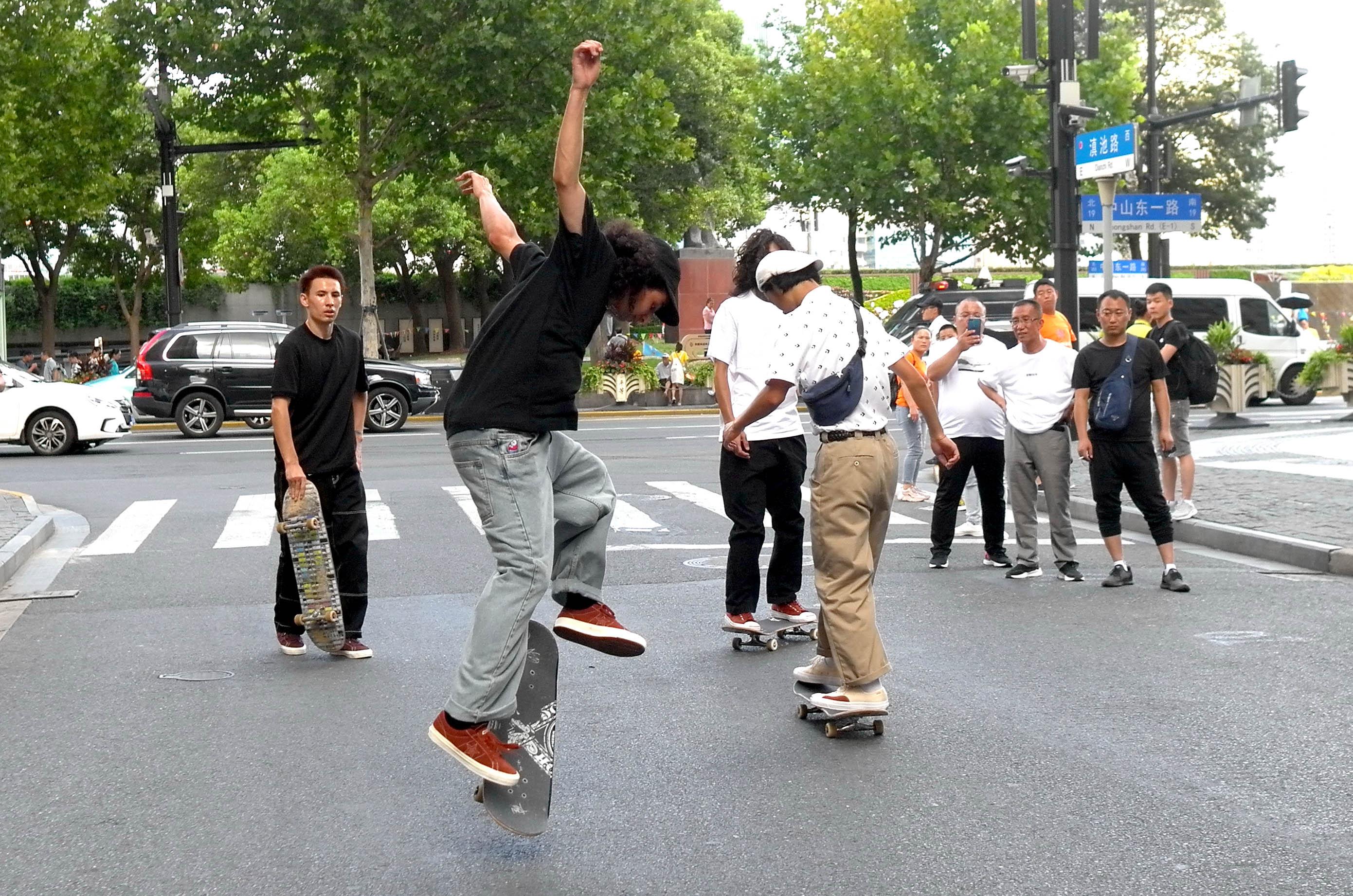 这一路口车辆游人川流不息,可玩滑板者全然不顾自顾玩着花样,行人则远远躲避。