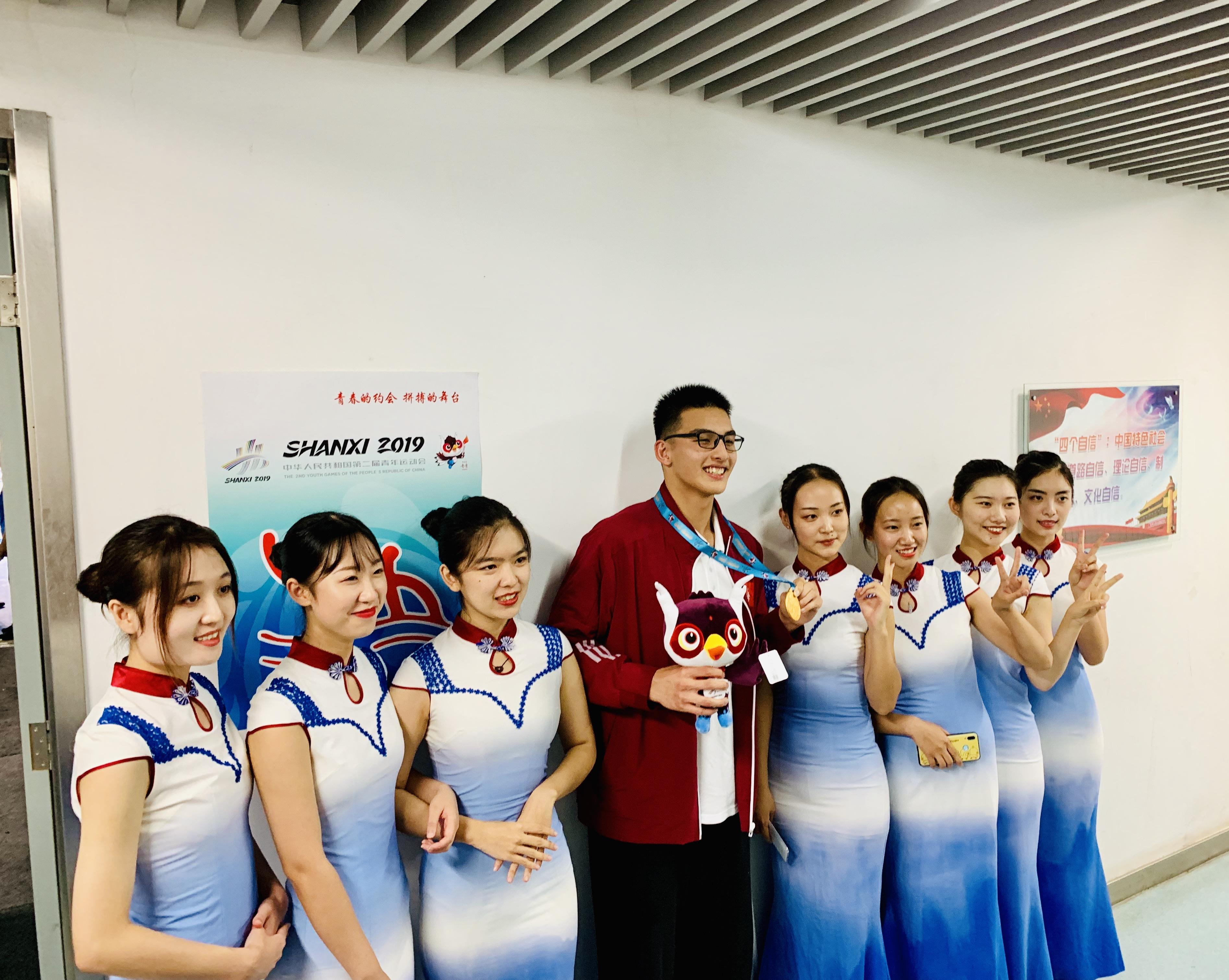 而走出颁奖室,一群礼仪迷妹更是“突然上线”,在运动员通道里将郑英昊围了起来,与这位金牌得主合影留念。1米93的大高个,带着自信阳光的笑容,言行举止谦逊礼貌,如此受追捧的确也不足为奇。