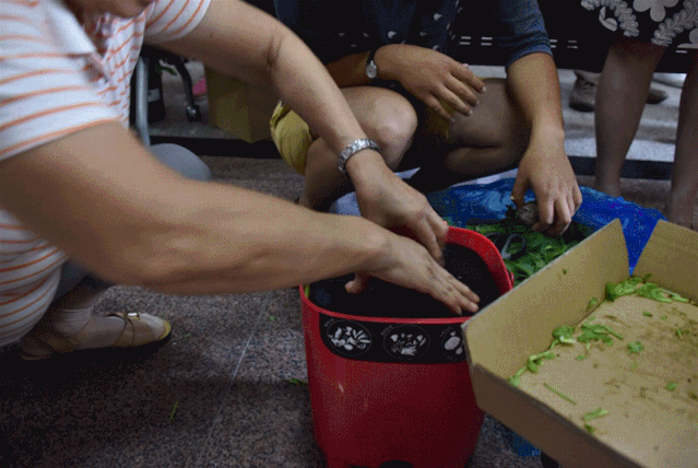 于是,在长宁区绿化市容局的支持下,虹旭小区选择了两个楼道作为试点,为居民免费发放迷你堆肥桶,并同时配备EM菌粉和种子,让居民们在家中就可以自行“生产”肥料。