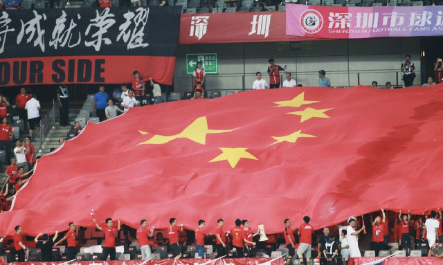 北京时间8月14日晚,在中超第22轮深圳主场对阵广州富力的比赛中,看台上突现一张巨幅五星红旗,深圳一万多名球迷高歌《歌唱祖国》,情动全场。