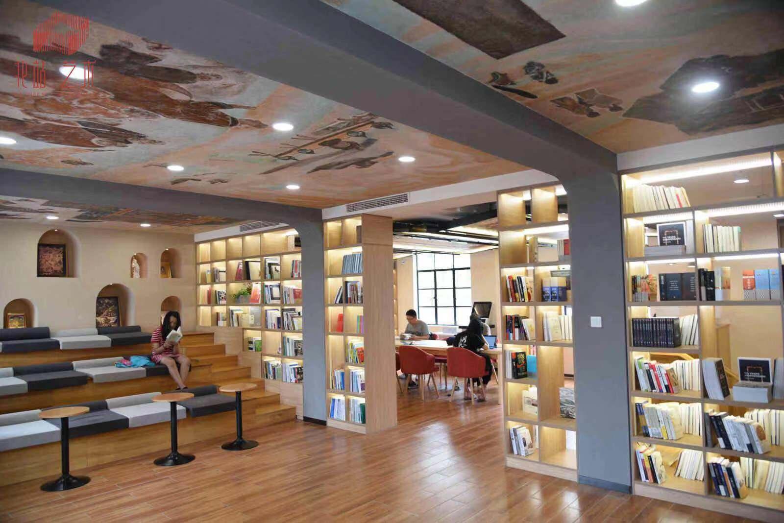 “丝路”和“敦煌”成为了阅读空间的重点艺术风格,两侧的墙面上模拟莫高窟“开凿”了拱形“门洞”,摆放石窟壁画的仿制画作,展架上陈列了非常有特色的雕塑……艺术元素的合理融入呈现了一个可以漫步的阅读空间。