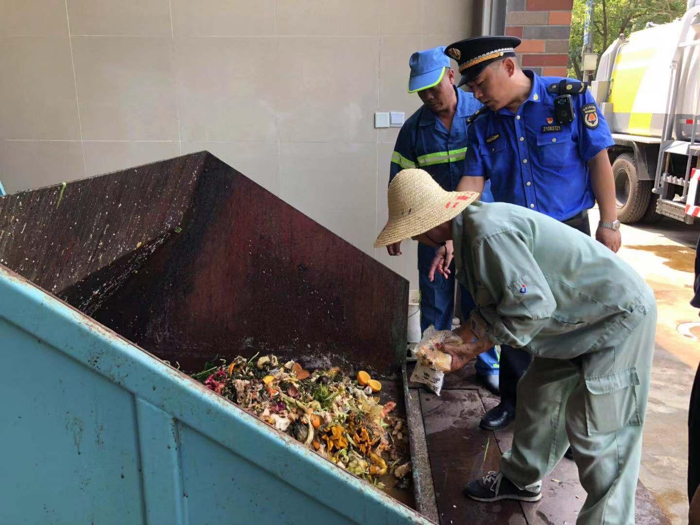 由于违反了《上海市生活垃圾管理条例》相关规定,城管金桥中队对碧云物业开出了当场责令整改通知单。保洁员立刻将干垃圾卸下,将湿垃圾倾倒至垃圾压缩站。