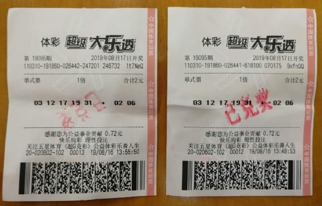 8月17日,第19095期体彩大乐透前区开出号码“03、12、17、19、31”,后区开出号码“02、06”。位于上海市松江区西林北路1761弄1号的20602销售网点命中三张一等奖彩票。其中,3注1800万元出自一张经3倍投、5注号码、45元投入的单式追加倍投票,单票擒奖5400万元;2注1000万元分落两张彩票上,中奖彩票各为一张1注号码、2元投入的单式票。