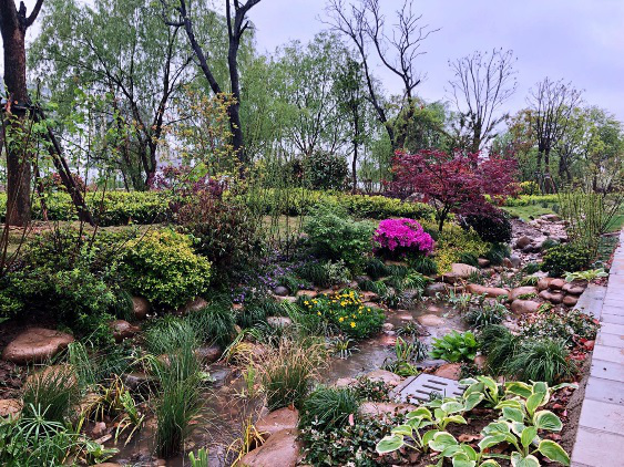“各种海绵设施的共同作用,使得小区能够像海绵一样吸水、蓄水、净水。”吕永鹏说。以雨水花园为例,它是一种下部有特殊结构、上部种植植物的绿色海绵设施,一般设置在广场、建筑物、道路两侧的低洼地,用于消纳屋面雨水和道路径流雨水。雨量较大,路面产生径流时,就可以通过一个专门设置的进水口进入雨水花园,超过雨水花园调蓄能力时再溢流进入雨水管道,这样,下雨时水就不会积在路上,也不会同时进入雨水管道,而是分散在各处就地解决,最后流出的水少了也清了。高位花坛等其他海绵设施也具有一定的调蓄容积,也能以类似的原理分散消纳一部分雨水。