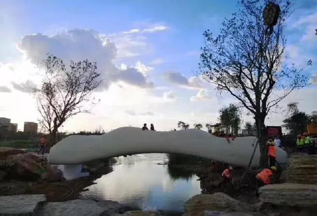 设计者匠心独运,将3D打印景观桥的主题设计为云与水,提取了百崎湖生态连绵带山水田塘展示区场地中的山、水、林、田、塘之意境,以简洁动感山水的流线为元素,追求山峦起伏、行云流水的视觉效果,衬托海丝文化。此后还将结合旱溪雾森效果,打造一座时尚梦幻的山水桥,营造自由变幻、富于动态、序列的桥体形态,让人耳目一新。