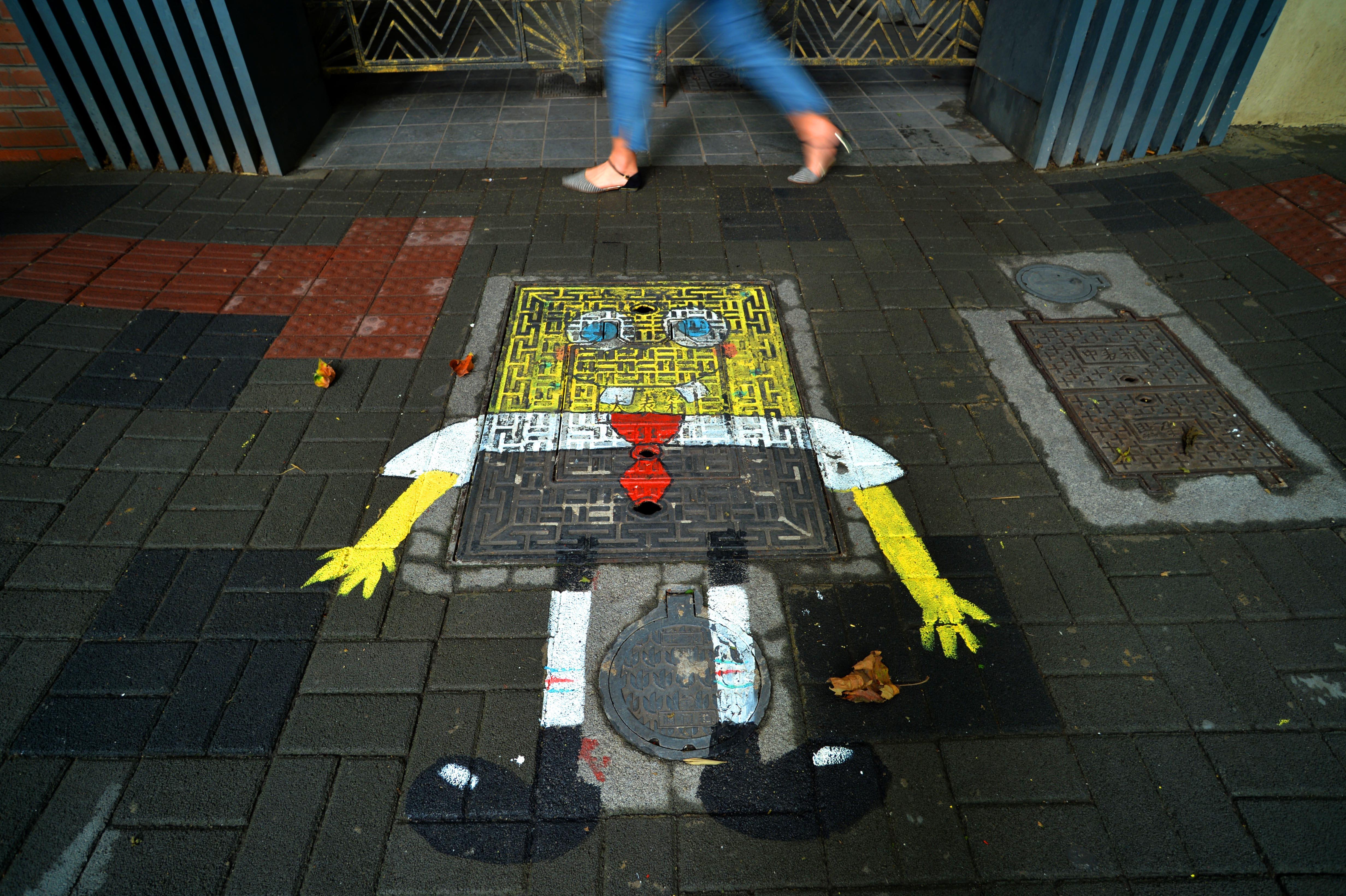这两天,路过武夷路的市民会发现,两侧人行道上的各式窨井盖被涂鸦上了极具创意的图案。