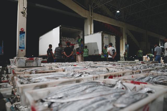 老陈的碎碎念被中国水产城过来拉海鲜的小货车给打断了,渔船上的海鲜搬上小货车后,将会通过一条长180米的海上堤岸,被运送到中国水产城的交易大厅。