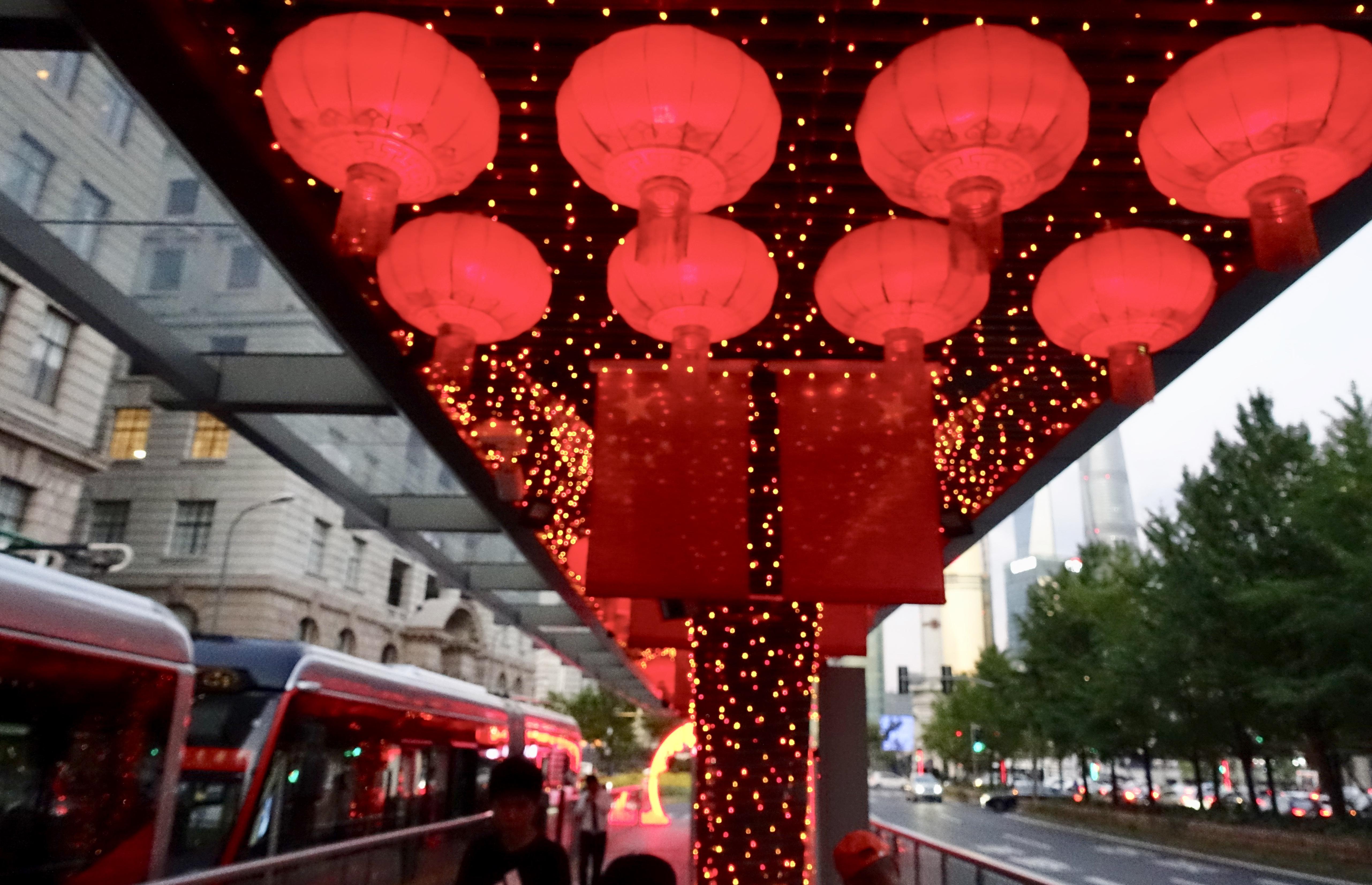 上海公交“老牌子”71路开线70周年了,它与新中国一同成长。今夜,外滩终点站流光溢彩,124只大红灯笼、32面五星红旗、70周年标识、顶部和立柱的满天星……这里的喜庆氛围营造浓浓,路过的人们都会情不自禁看上一眼。