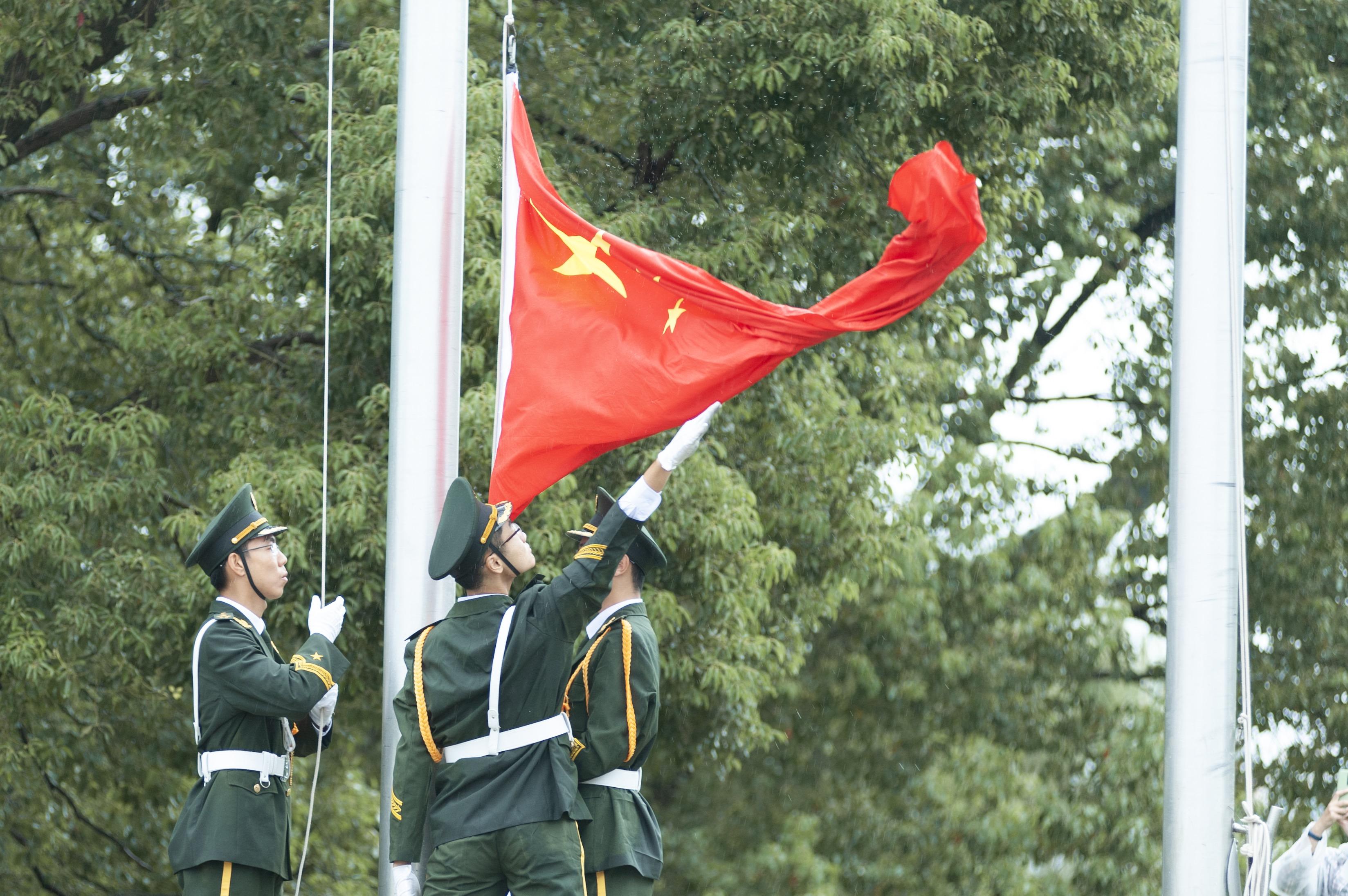 “行注目礼,升国旗,奏唱国歌!”华东政法大学松江和长宁校区内,在雨中,华政国旗护卫队员正步行至升旗台,步伐铿锵有力。五星红旗在现场师生代表注目下缓缓升起飘扬在校园上空。