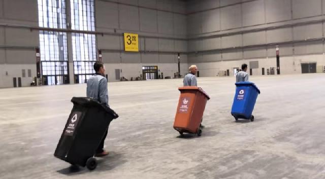 据悉,今天的演练过程中还对场馆内就餐高峰时段道路保洁、大量干湿垃圾分类及转、外运等进行了测试,从而检验对大客流生活垃圾分类驳运实际操作能力和大客流状况下道路两侧废物箱满溢及道路保洁的垃圾快速处置能力,“正常情况下我们的垃圾清运车辆是通过主通道运输的,如遇展会期间的大客流,我们将会采取人工换桶的方式,通过专门的通道将垃圾运输至临时应急点。”