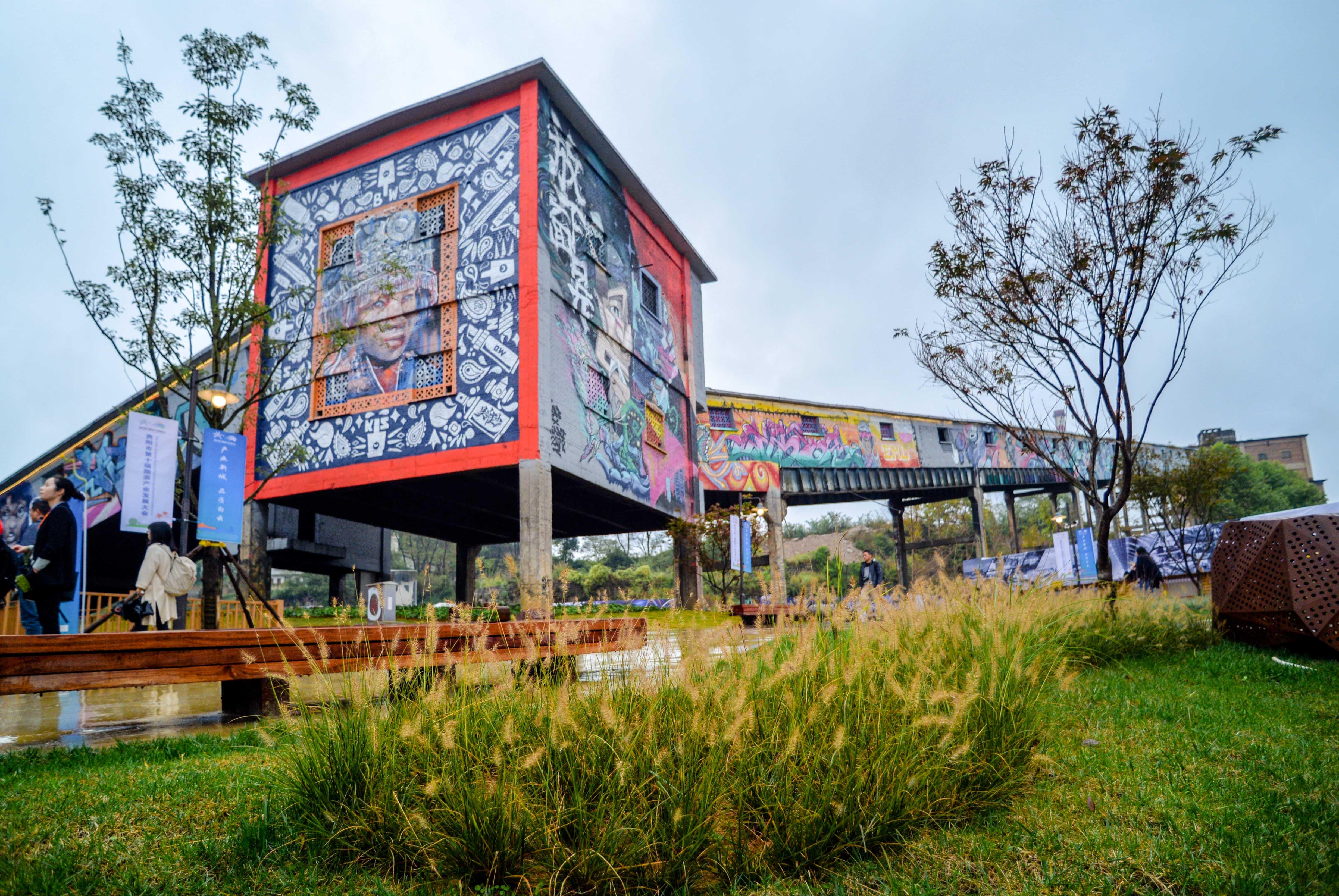 如今,长长的传送带早已停止工作,取而代之的是艺术家们用他们神奇的画笔,通过涂鸦有苗族少女的装扮、有非物质文化遗产蜡染等,为老厂房赋予了新的意义。