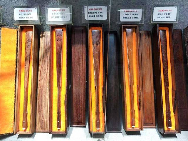 在展示区,有一个橱窗里摆放的都是“镇馆之宝”。老红木狗头扇、微凹黄檀猴头扇、红豆杉木仕女扇,每把扇子的木质纹路上都能看出对应的图案。朱镇虞介绍说,这都是他做折扇前在开料时发现的,可遇不可求,非常罕见。