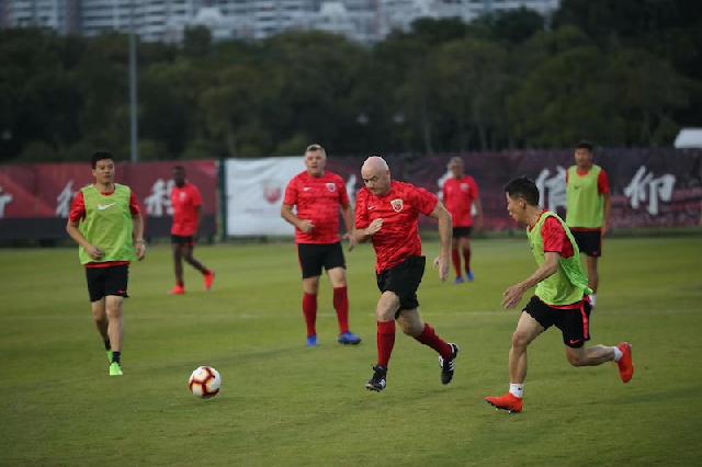 犯了“球瘾”国际足联“老大”和同伴们换上了有上港队队徽的球衣,与东道主上港俱乐部的高层和球队工作人员来了一场足球友谊赛。