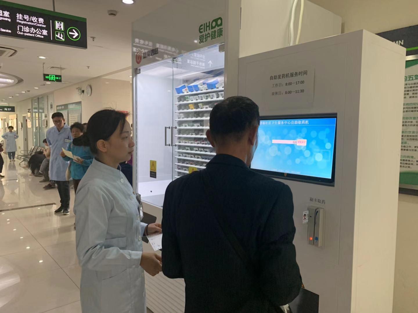 在曹杨社区卫生服务中心门诊大楼二楼的“糖尿病小屋”旁边,竖立着一台外形酷似自助饮料贩卖机的机器,不同的是,它里面装的不是饮料,而是各种各样的药品,它就是中心新研发的无人“自助发药机”。