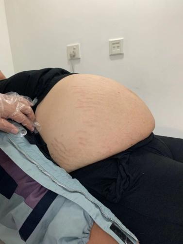 腹腔囊液16000ml,包块最大径40cm,腹壁布满“妊娠纹”。