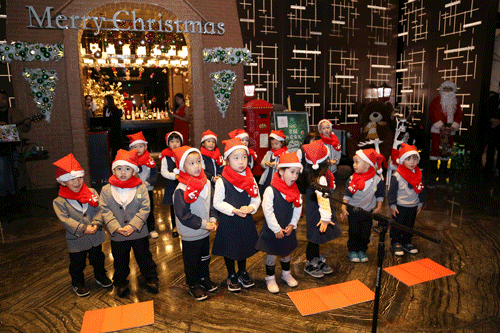 圣诞点灯仪式在酒店大堂举行:高达6.5米的绿色圣诞树、布满圣诞甜品的圣诞小屋、拉着榨汁自行车的小鹿,以及现场乐队唱响的美妙圣诞乐曲,让来宾沉浸在圣诞的浪漫布置当中,感受着浓郁的圣诞氛围,开心地和圣诞老人一起在大堂合影留念。