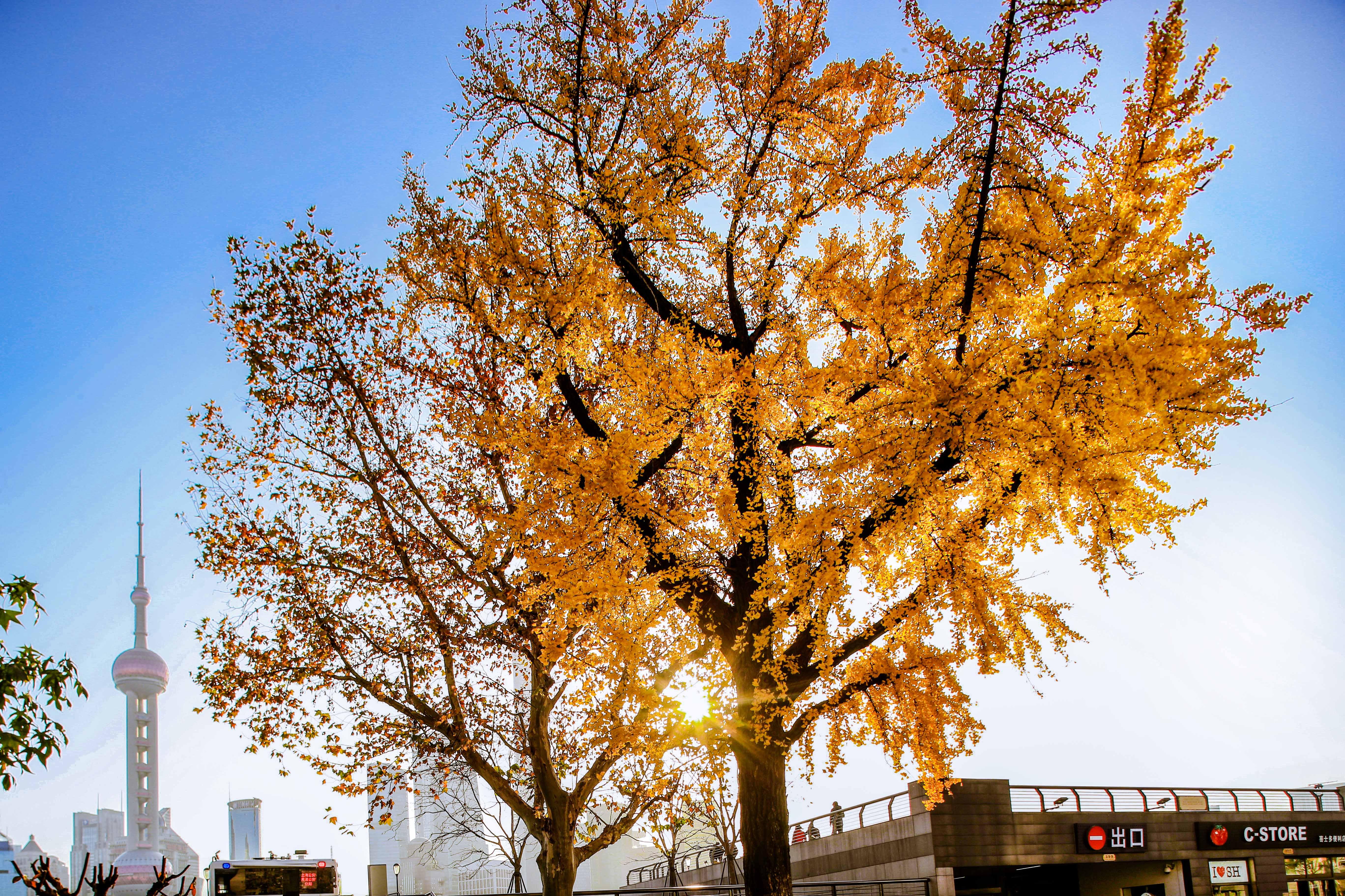 外滩靠近北京东路口有棵古银杏树,这两天,整株树通体“金黄”,在阳光的照射下,愈发璀璨。