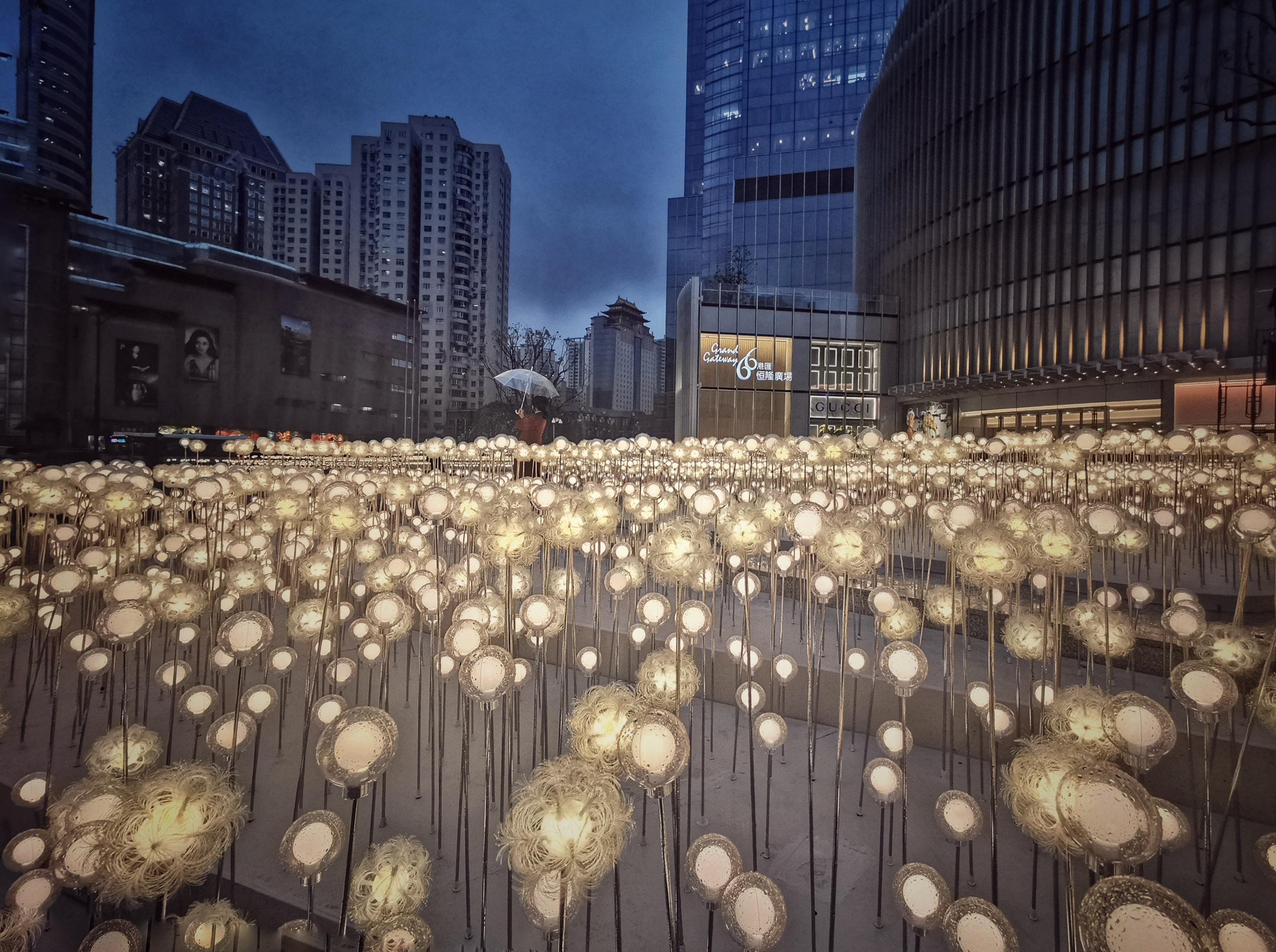 今晚的港汇恒隆广场前亮起了一片蒲公英灯海,在夜色中与徐家汇景色遥相呼应,美不胜收。