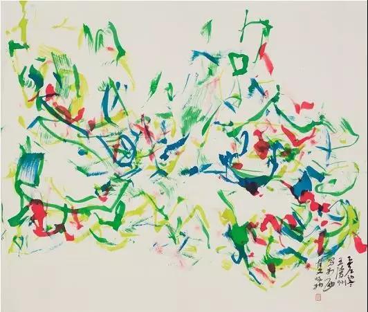 他的画,乍看是大写意花卉,但实际上,他的用笔、用墨,都不拘泥于传统。他的花卉作品里,除了用毛笔,还有大量的排笔,在笔意、笔势、用墨、用色上,都和传统书画同源的要求相去甚远。