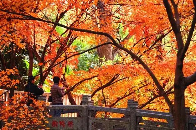 在“秋林爱晚”景区,青枫、红枫、鸡爪槭等各类枫树已经集体被大自然的调色板染红。片片红枫,点缀了美丽森林,如诗如画。