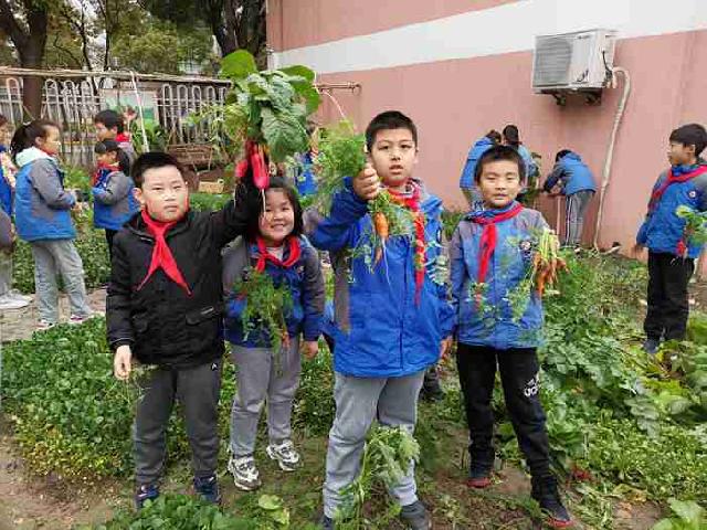 而在种种劳动内容中,文首的“幸福田园”是人气最高的项目,目前只针对四年级一个年级开放。朱雯告诉周到君,这片200平米见方的田园本是学校操场的一块闲置空地。开辟为菜园后,被划分成70多块小菜地,每六七个学生领种一块菜地,春天种黄瓜、番茄,秋天种萝卜、杭白菜……不仅成为劳动教育的最佳实践,也成为自然课程的鲜活课堂。“在全校各年级启动实施劳动教育,探索学科教学与劳动教育相融合的内容,这本来就是我们推行劳动教育的初衷。”