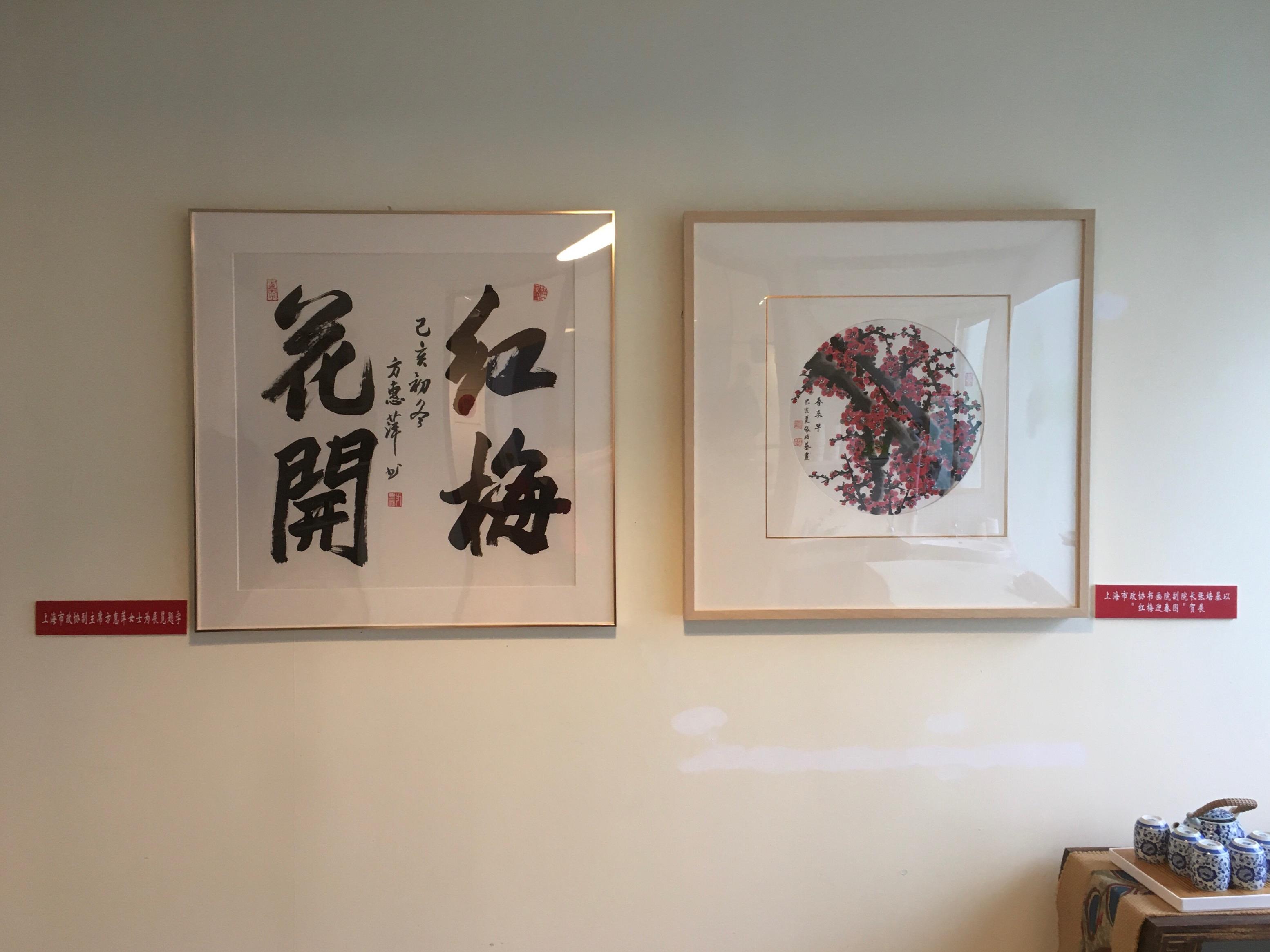 此展是“红与梅”的组合。取自两位女性艺术家名字,恰逢辞旧迎新之际,以红梅为亮色,勾画冬日美景,表达翰墨飘香、喜迎新春之意。展览中,徐梅的字与肖素红的画契合完美,可谓珠联璧合。