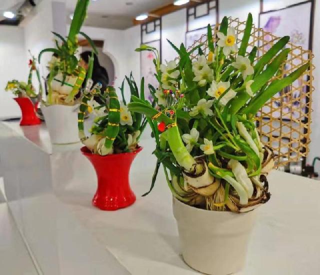 今年的新春市民水仙花展共设三个主题展区,分别为水仙花科普文化展示区、水仙花闹新春展区和水仙花雕刻造型展区,整个花展以水仙花作为主题花卉,并配置报春花、郁金香、风信子、角堇、梅花等年宵花卉进行造景,烘托新春佳节的喜庆氛围。
