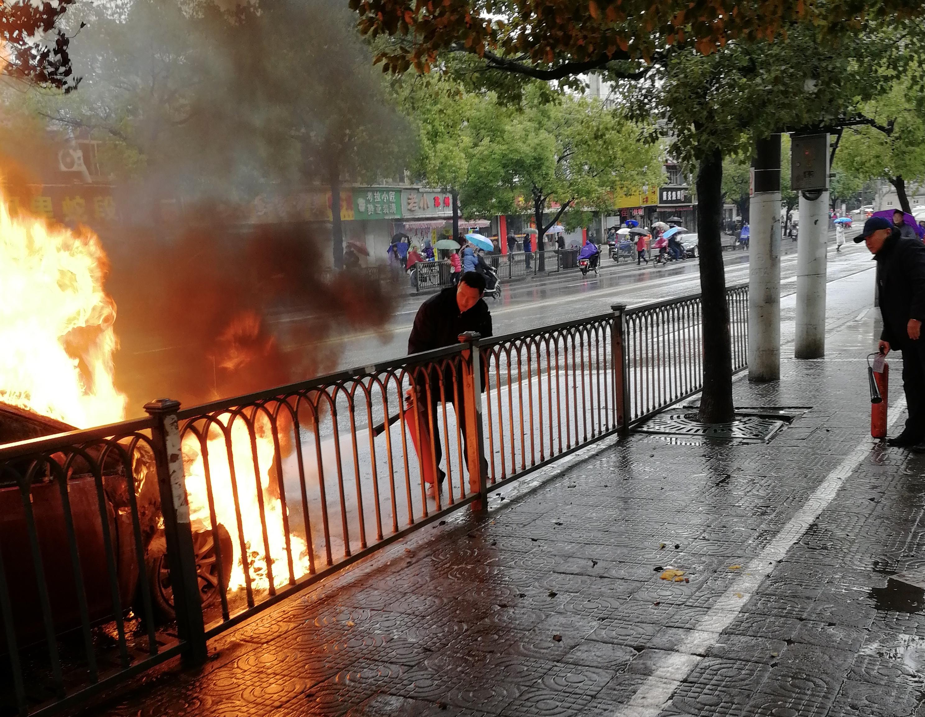 当时,管斌首先拨打119火警电话,并跑步折回车队喊上行管员拎起4个灭火器返回现场救援。自燃车辆已是浓烟滚滚、火势猛烈。