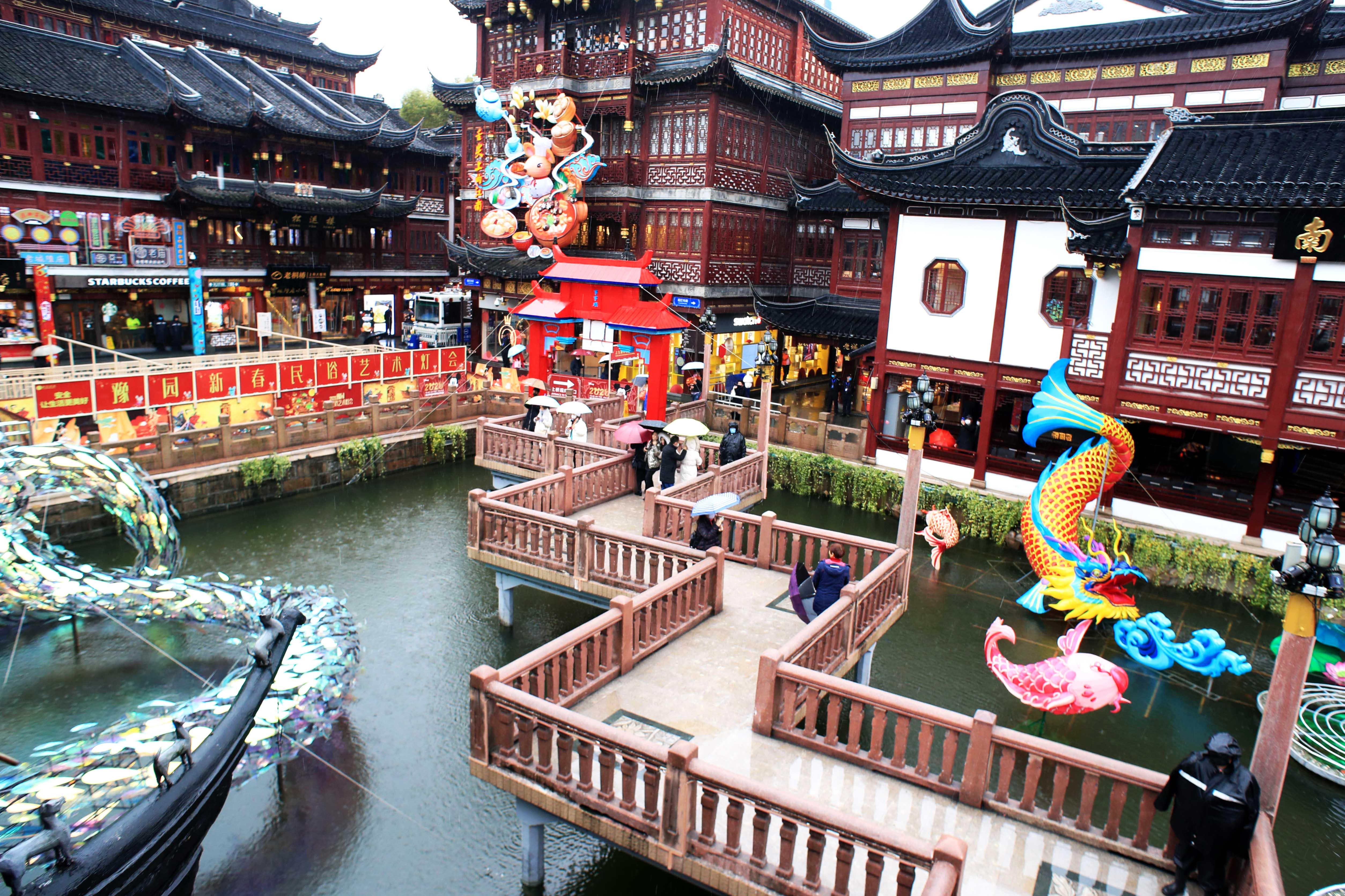 对于很多老上海市民来说,大年初一有个传统的习俗,一定要到豫园九曲桥上走一走。不过,今天上午雨水越下越大,来走九曲桥的市民和游客明显不多。